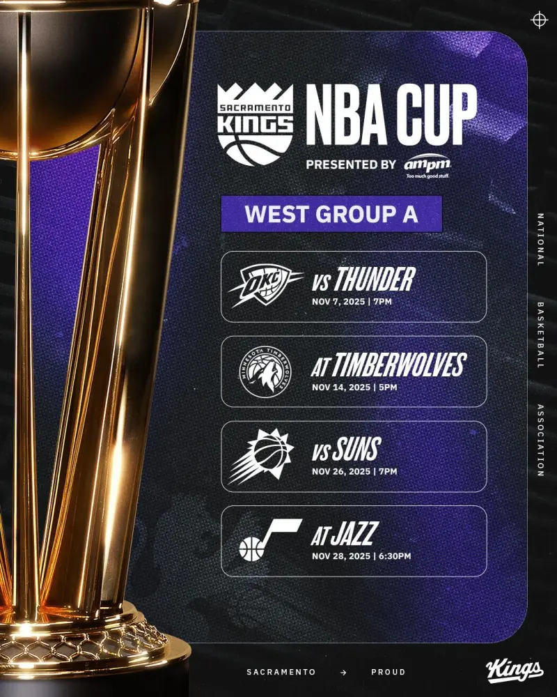 虎扑09月03日讯 国王官方更新ins,晒出了球队新赛季NBA杯小组赛的对阵赛程。