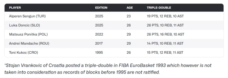 在如今的NBA,三双并不少见,有很多角色球员都能拿到三双,但在欧锦赛,三双可就不简单了,算上申京这一场,欧锦赛历史才出现过6次三双,此前的5次分别是: