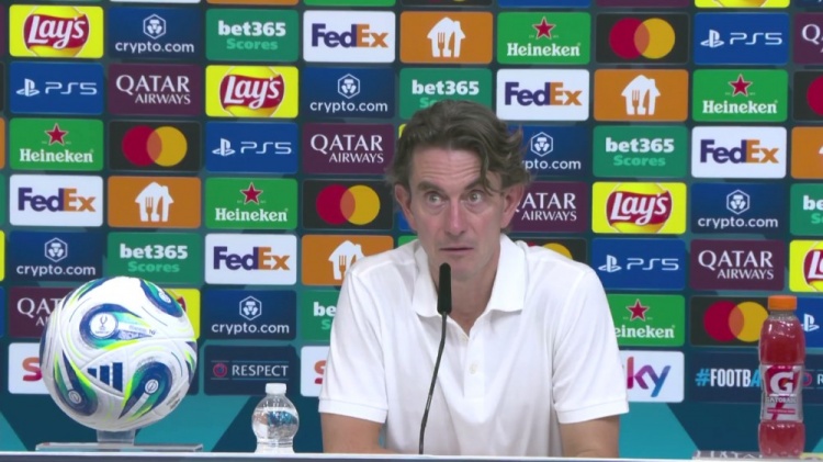 8月14日,欧洲超级杯决赛上演激烈对决,热刺与巴黎圣日耳曼在90分钟内战成2比2平局,最终在点球大战中遗憾落败。赛后新闻发布会上,热刺主教练弗兰克接受了包括随队记者阿拉斯代尔-戈尔德在内的多家媒体采访。