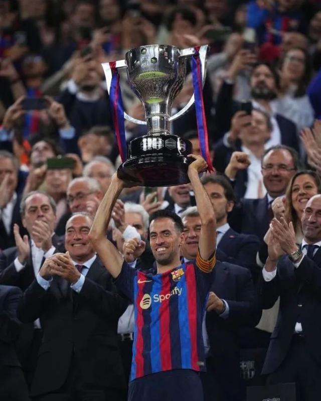 赛前客队皇家社会给新科西甲冠军巴塞罗那列队致敬,布斯克茨第一次以队长身份捧起西甲奖杯。