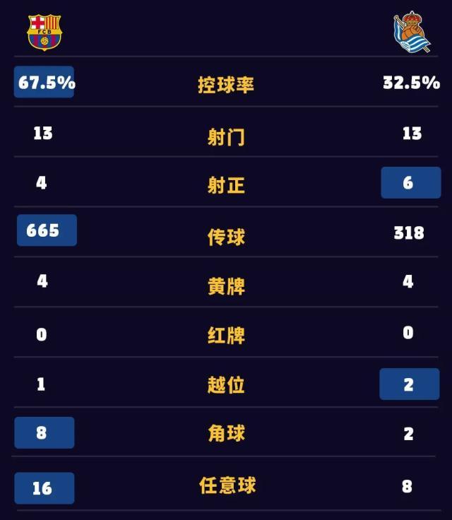 上半场比赛结束,巴萨暂时0-1皇家社会。